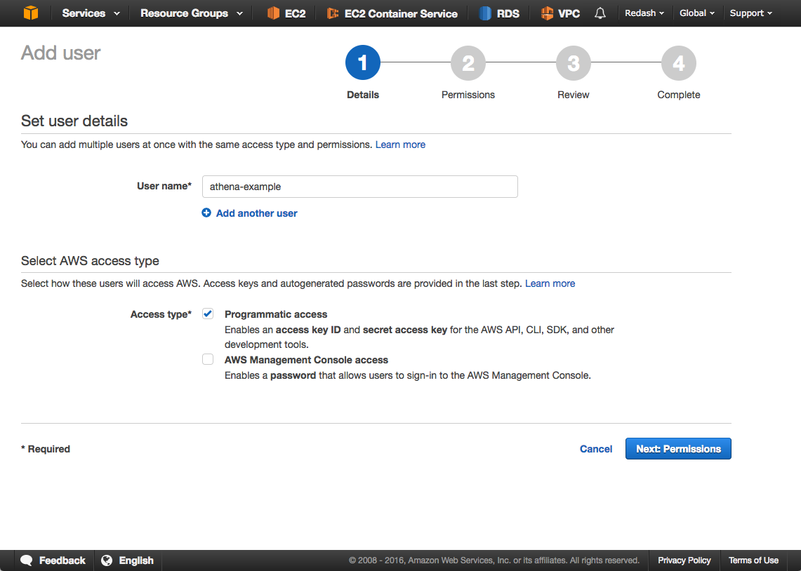 The first thing you’ll need to do is create an IAM user that will have permissions to run queries with Amazon Athena and access the S3 buckets that contain your data.