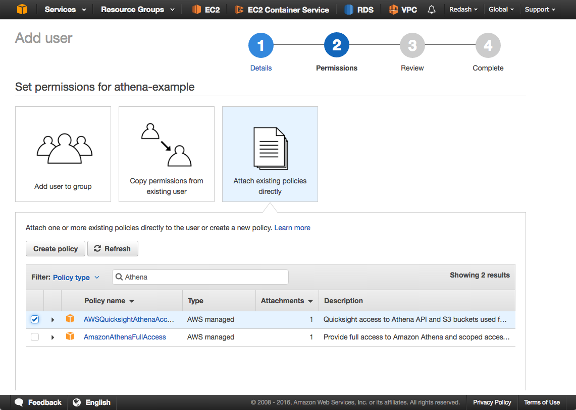 - In the Permissions step, select Attach existing policies directly and attach the AWSQuicksightAthenaAccess policy along with the one to access S3 buckets you created previously.