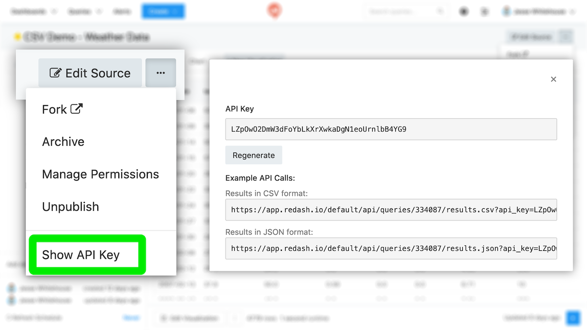 Visit any query page and click the horizontal ellipsis (…) above the query editor. Then choose Show API Key. The links in the modal that appears always point to the latest query result. You can choose between CSV and JSON formats to be returned by the API call.