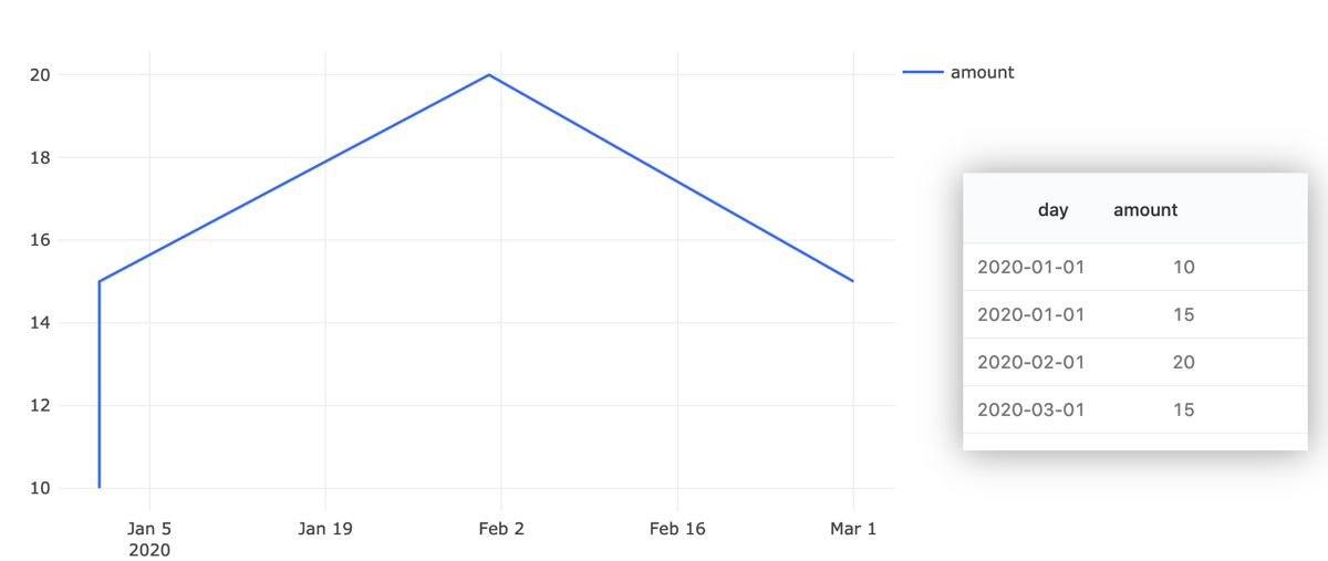 In this example a vertical line is drawn because there are two records for 1 January. You can resolve this by filtering out the doubled entries on the X axis. Or revise the query to include grouping field, as shown below.