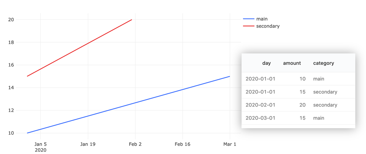 DataReporter is smart enough to figure out most common X axis scales: timestamps, linear, and logarithms. But if it can’t parse your X column into an ordered series, it falls back to treating each X value as a “category”. This can have mixed results:
