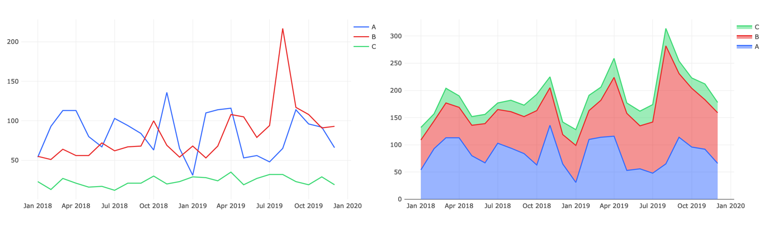DataReporter can “stack” your Y axis values on top of one another. The name name is borrowed from Stacked Bar Charts, but it can be useful with area charts as well. The below image shows the same data, unstacked on the left and stacked on the right.